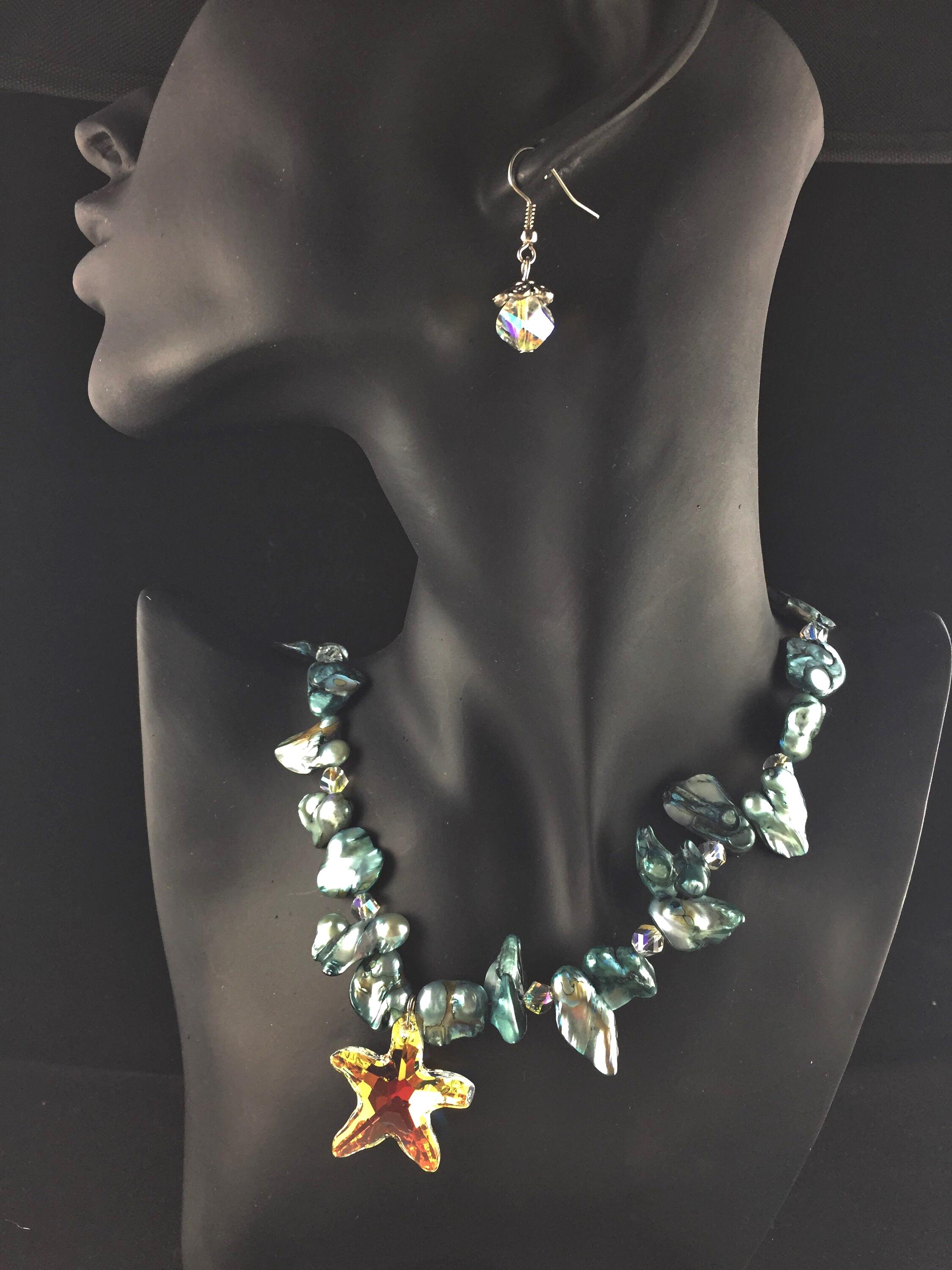Handmade two-piece earring and necklace set made with beautiful Turquoise color large and medium size sea shell beads and crystals. An AB crystal starfish hangs in the front. A pair of 10mm crystal earrings match the necklace. This is an absolutely elegant set, unique and comfortable to wear.