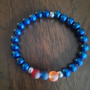 This elegant bracelet is made of 8mm woodlace gem beads, stainless dividers, a stainless tiny cross and three jade beads representing the Armenian flag. It is set on double strong elastic wires for quality. Fits M/L mens size. For custom sizes please contact by private message.