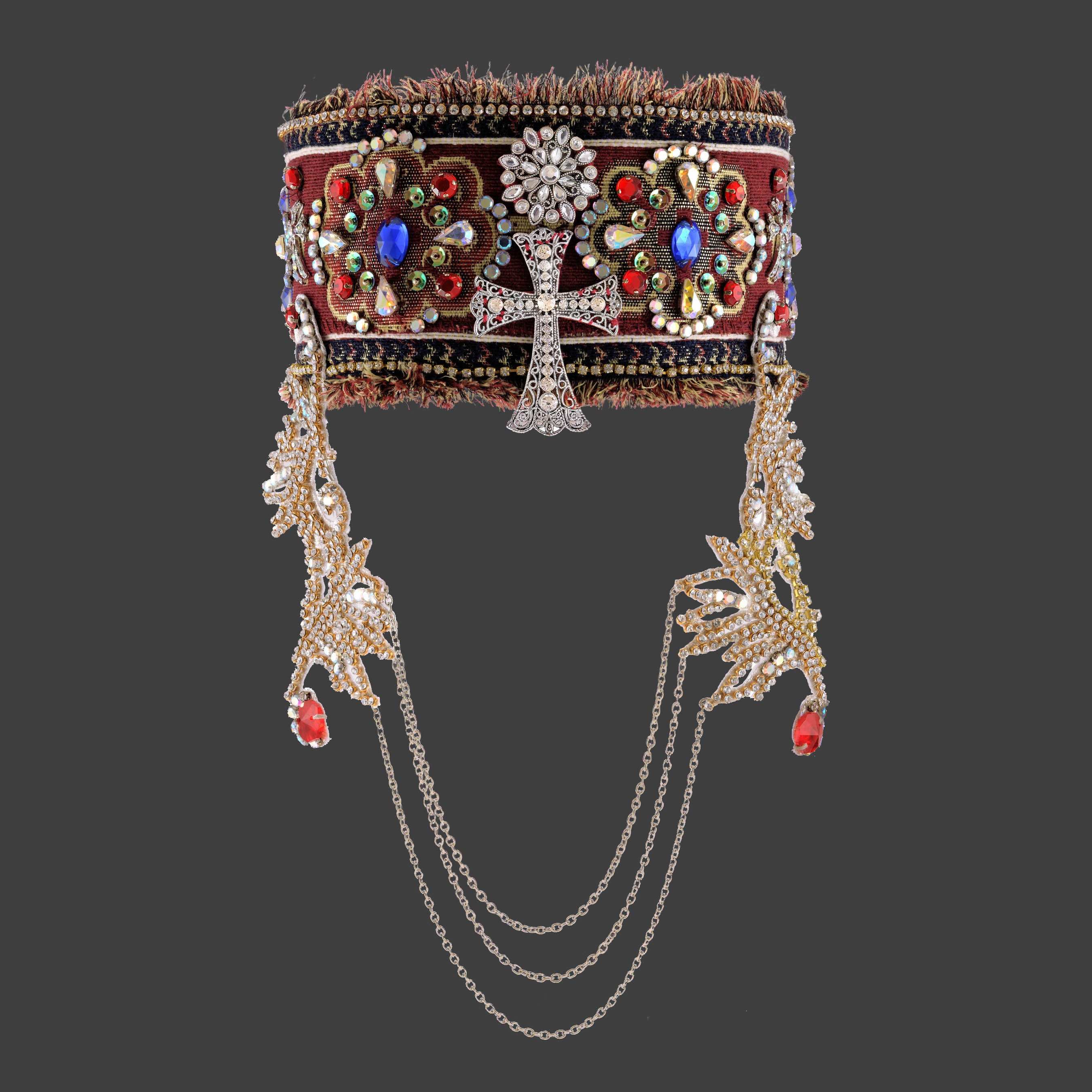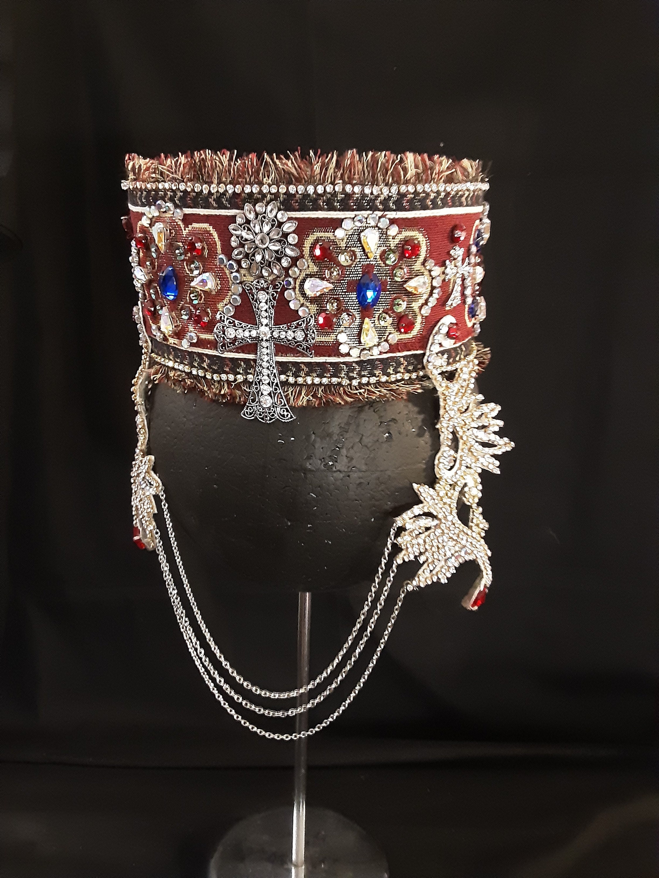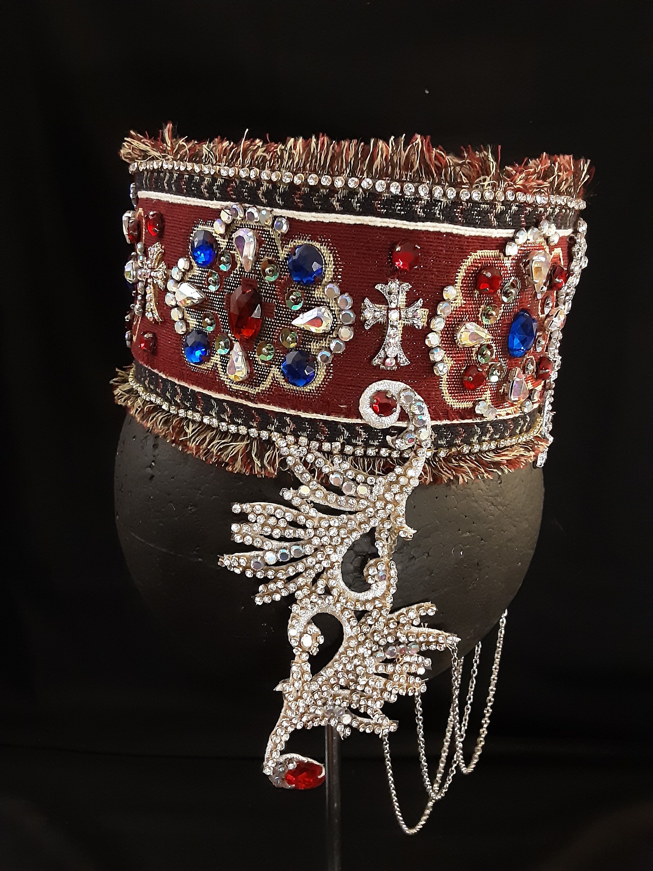 This ia a 100% handmade bridal headpiece covered with rhinestons , colorful stones, ornaments and chains symbolizing the beauty of the Armenian character. Fits women's M/Lhead size. It is a unique headpiece ready to ship.