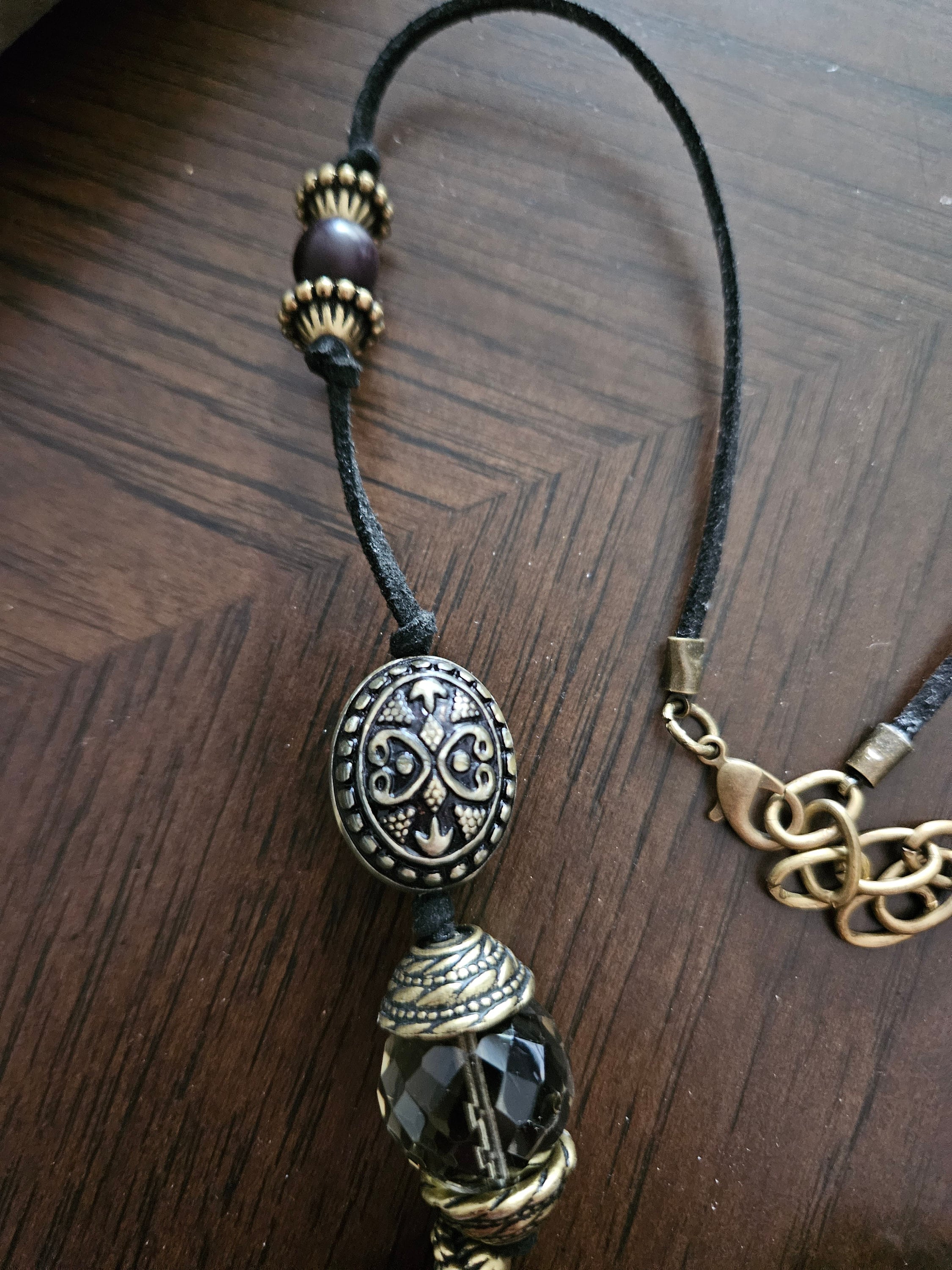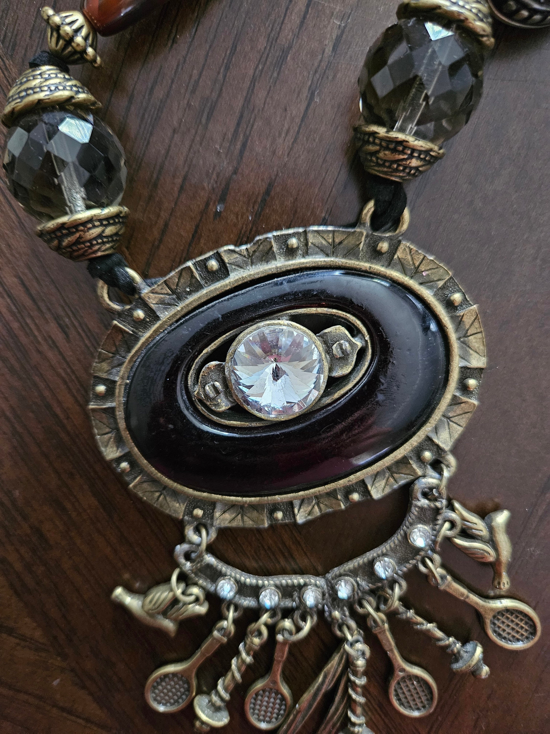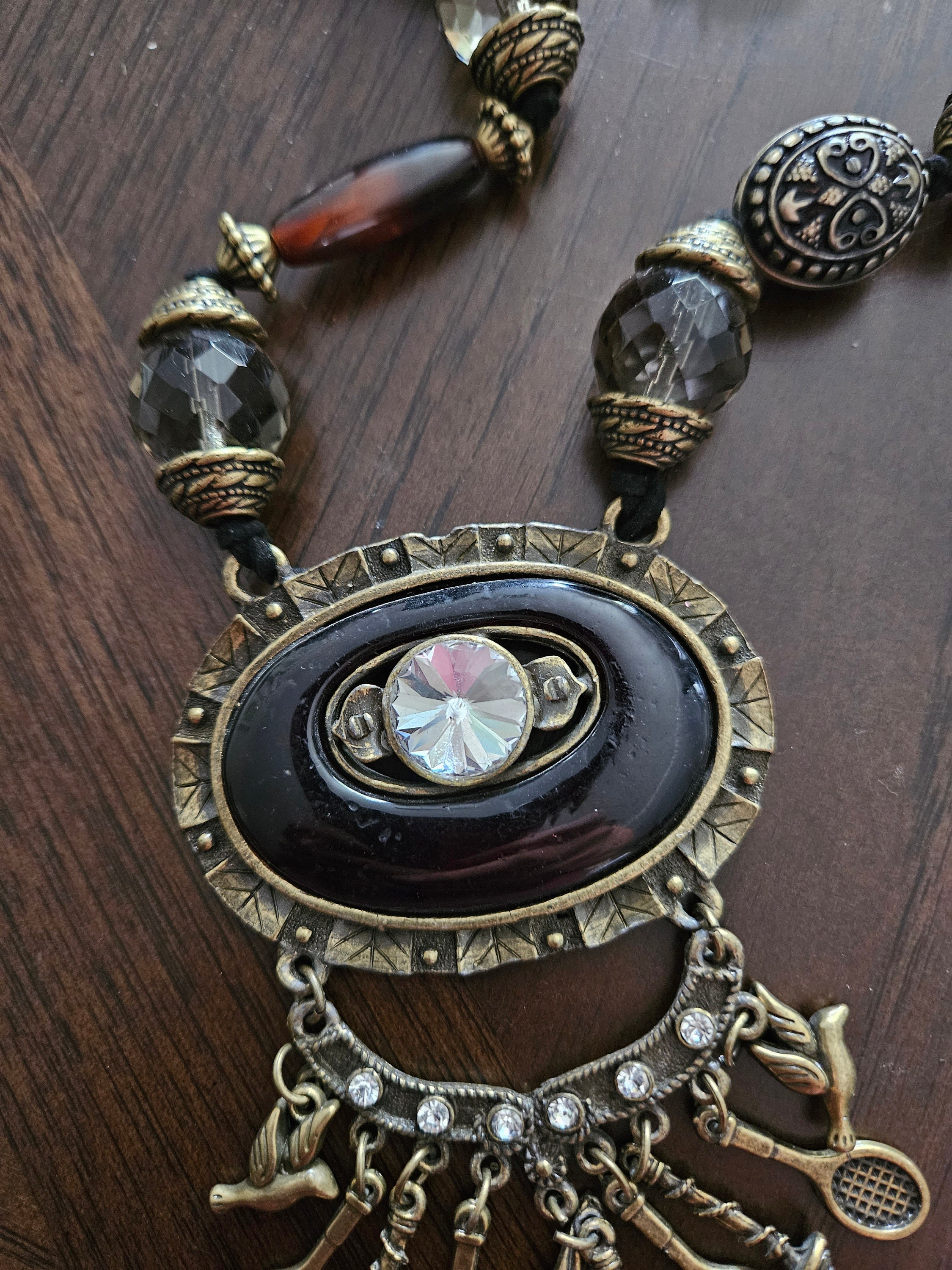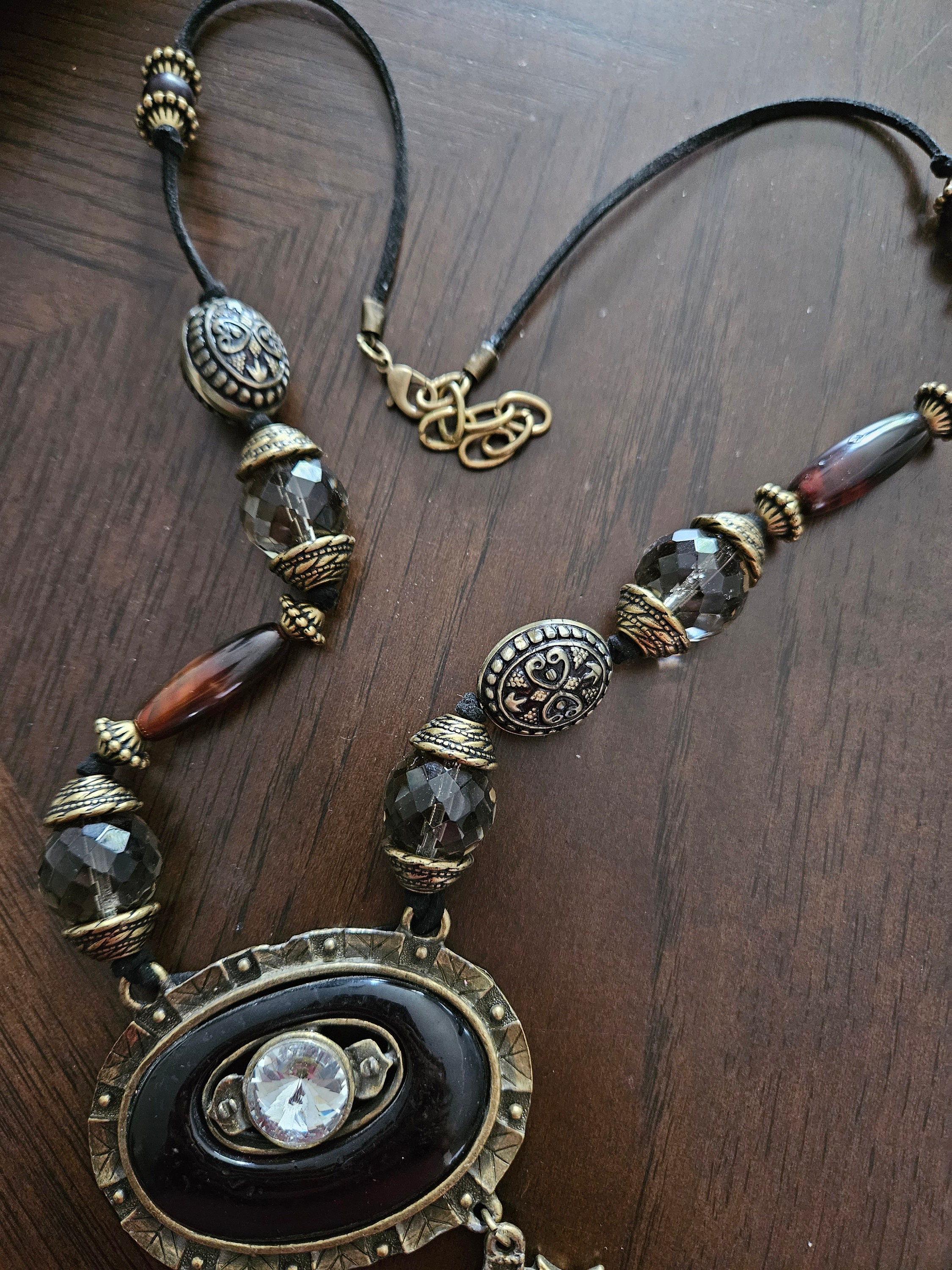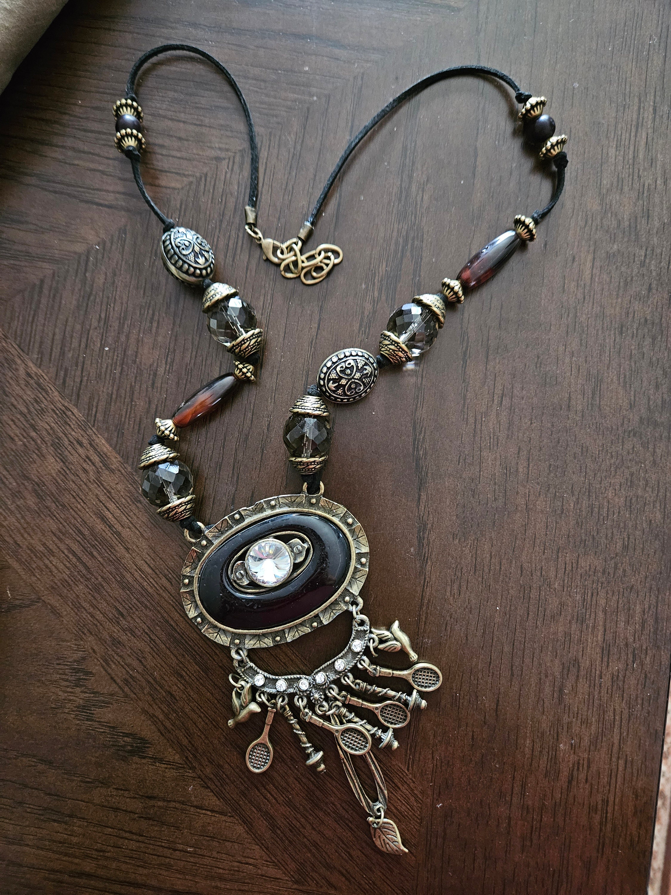 This is a 20" long, beautiful, statement necklace, made with a 3.5" wide resine pendant, large beads, crystals and ornaments hanging on a brown faux leather rope. The resine and the stones have a brown/red/ black shades in color. A lobster clasp is used for closure. Ready to ship.