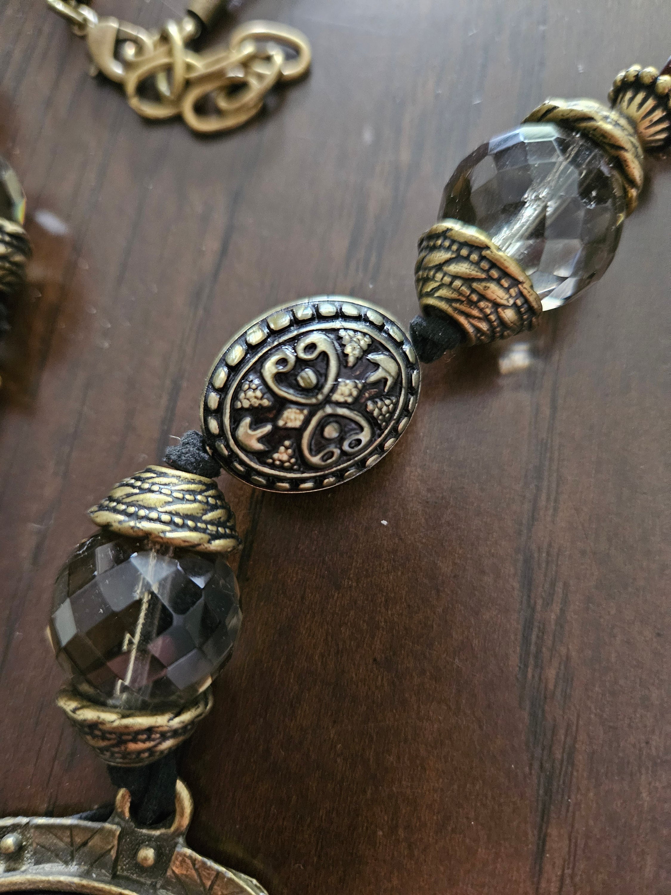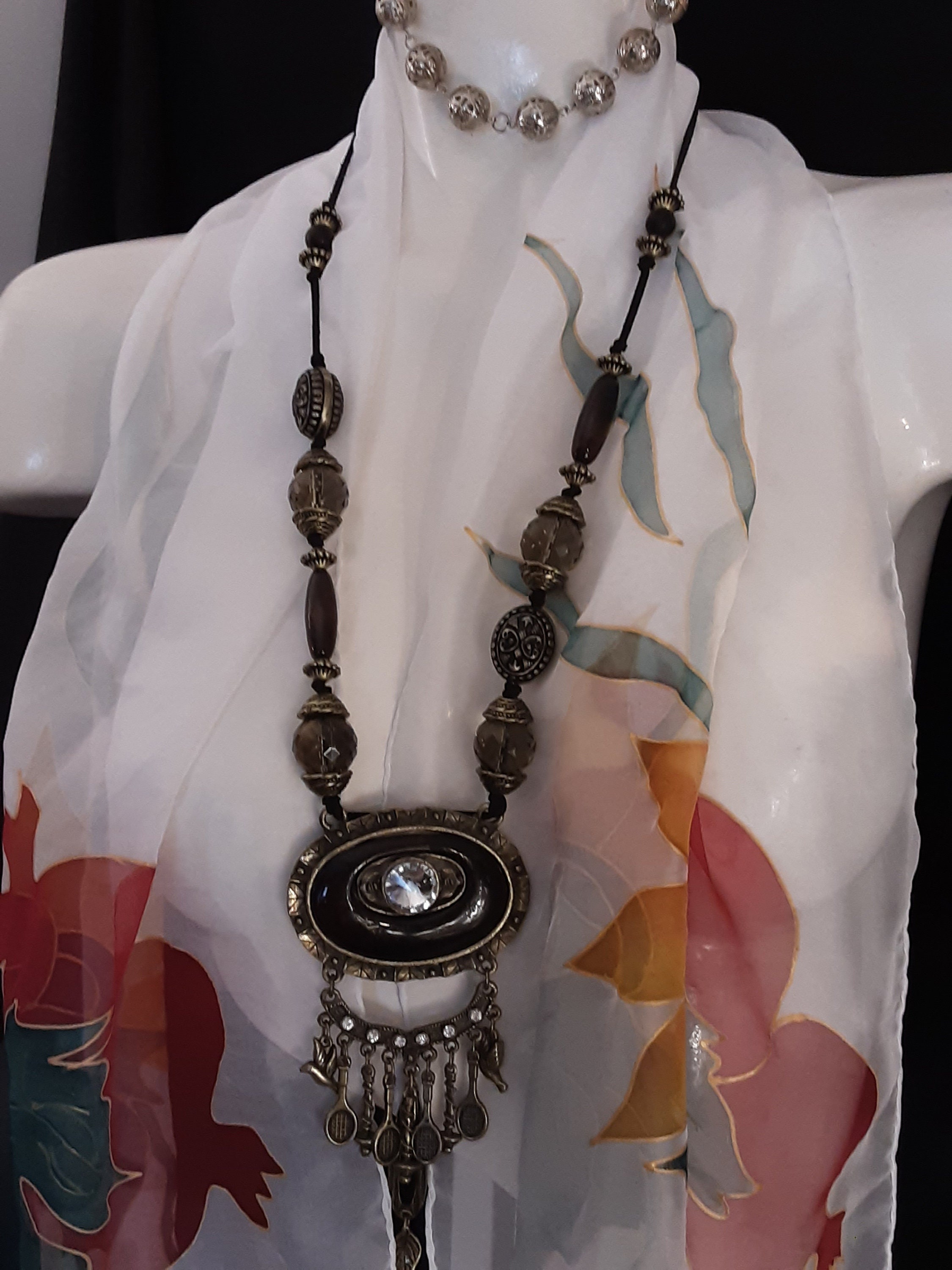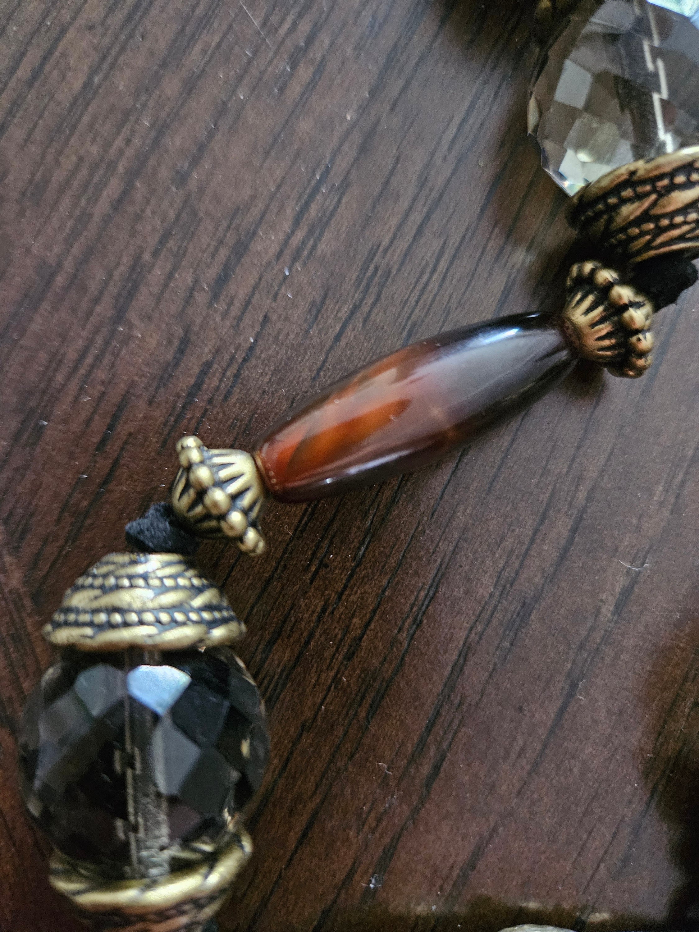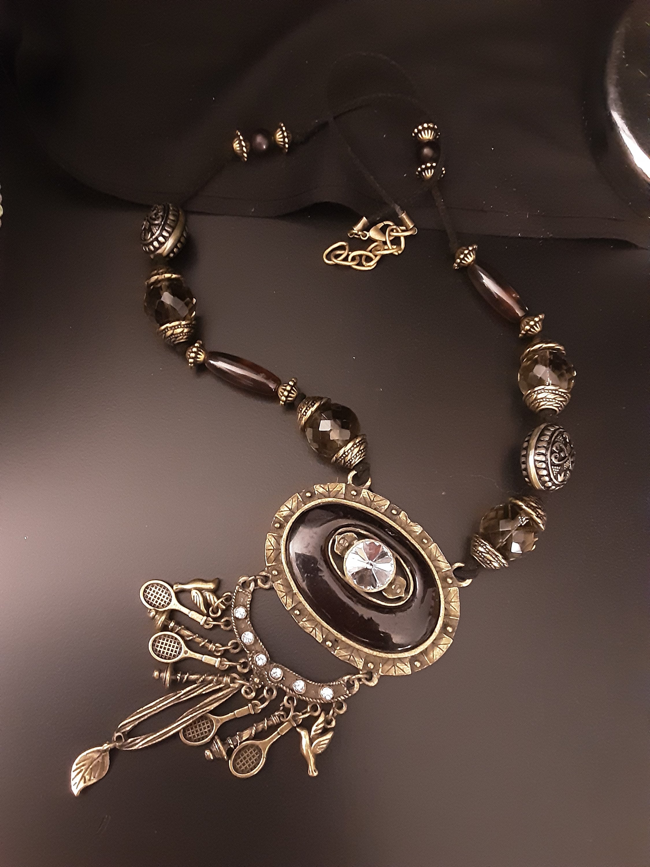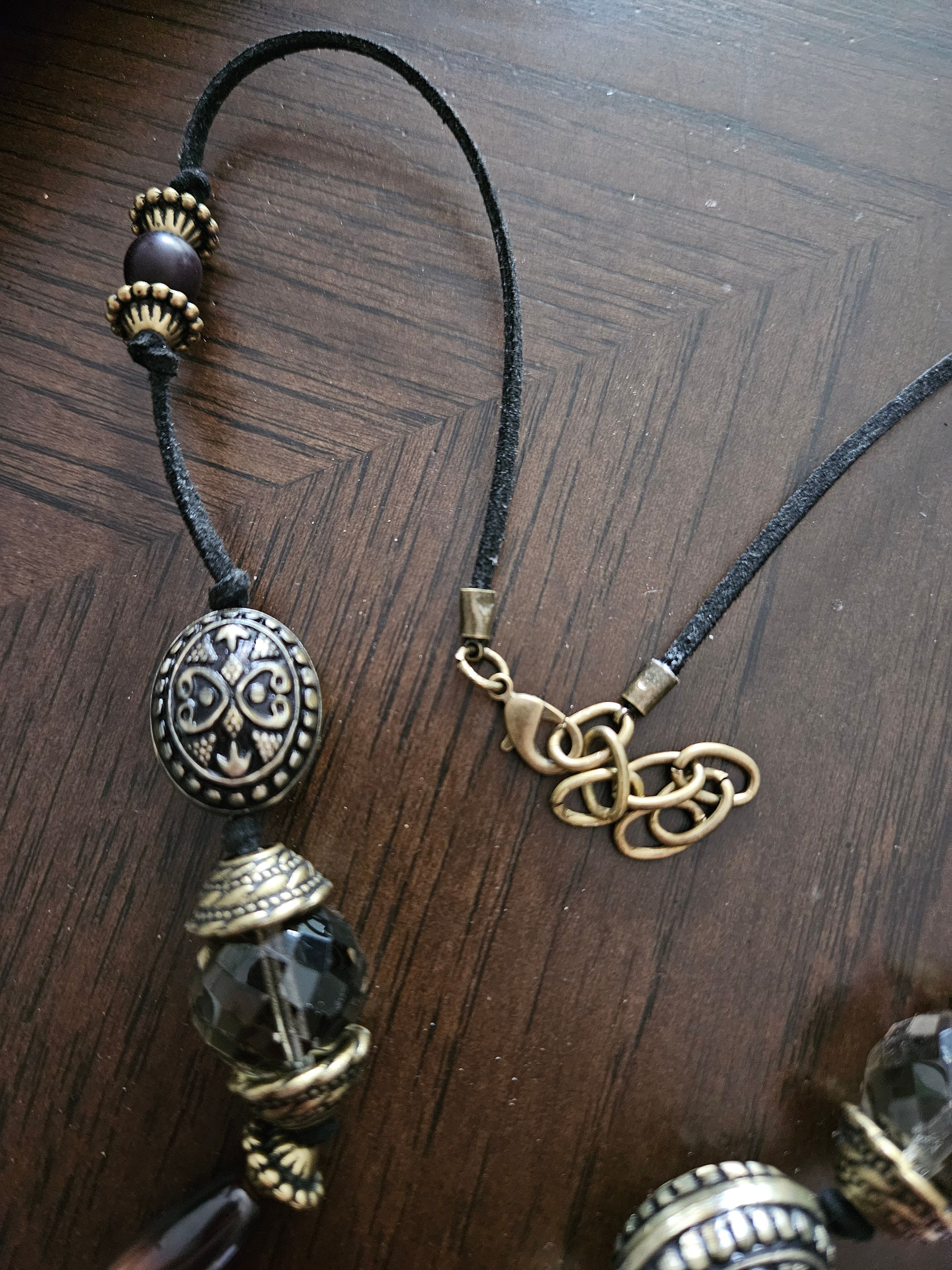 This is a 20" long, beautiful, statement necklace, made with a 3.5" wide resine pendant, large beads, crystals and ornaments hanging on a brown faux leather rope. The resine and the stones have a brown/red/ black shades in color. A lobster clasp is used for closure. Ready to ship.