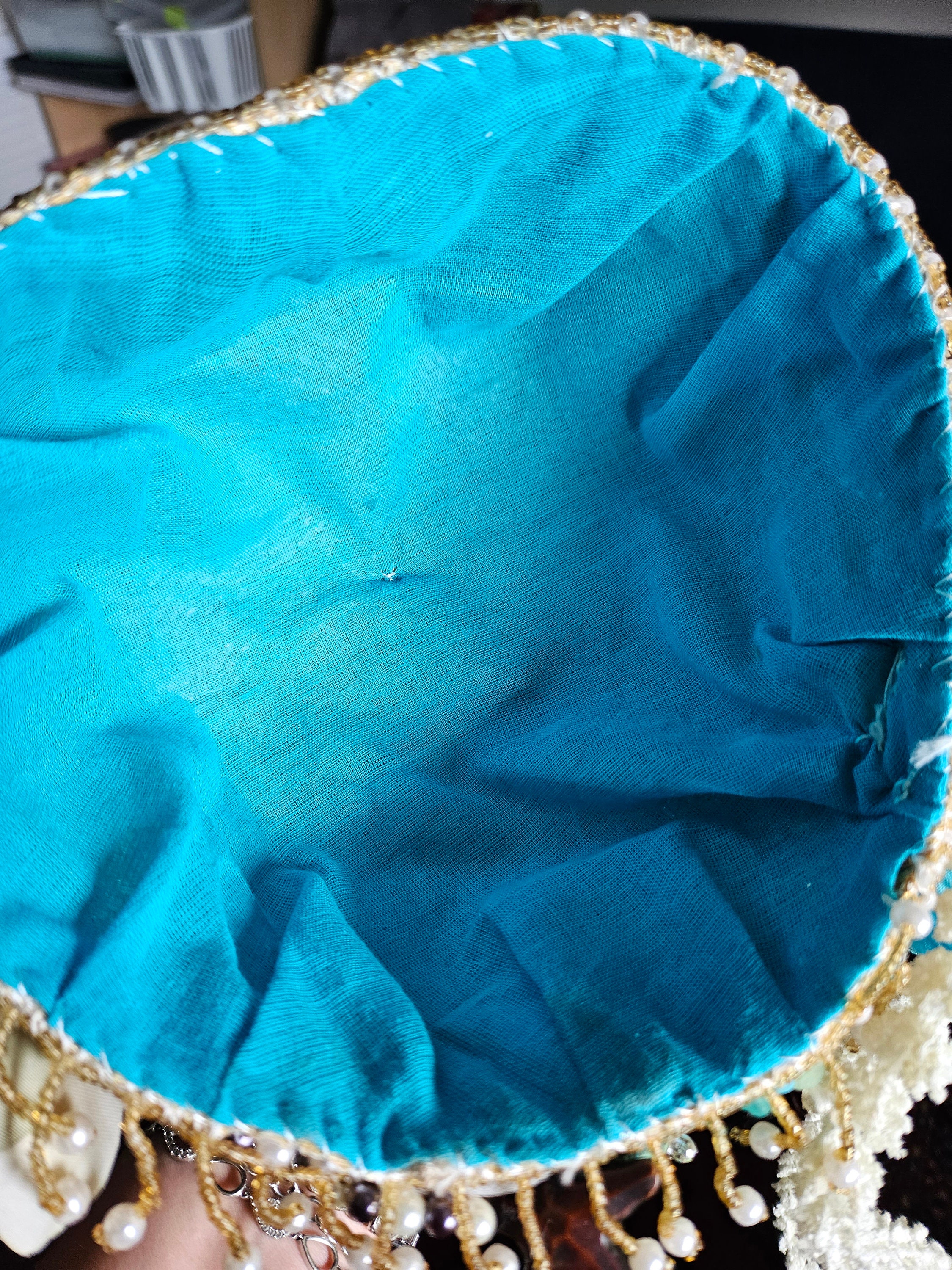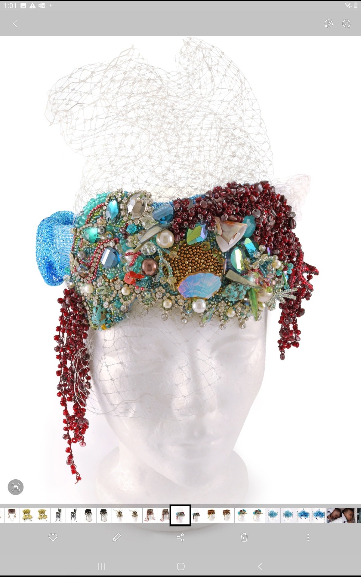The beauty of the ocean, the rays of the sun, the mistery of the underwater, all is hidden in this gorgious handbeaded headdress, crystals, rhinestones, colourful beads, gemstons, pearls, seashells and a net that adds the signature to it. The head band has elastic inside the mesh to fit perfectly. This is a masterpiece.