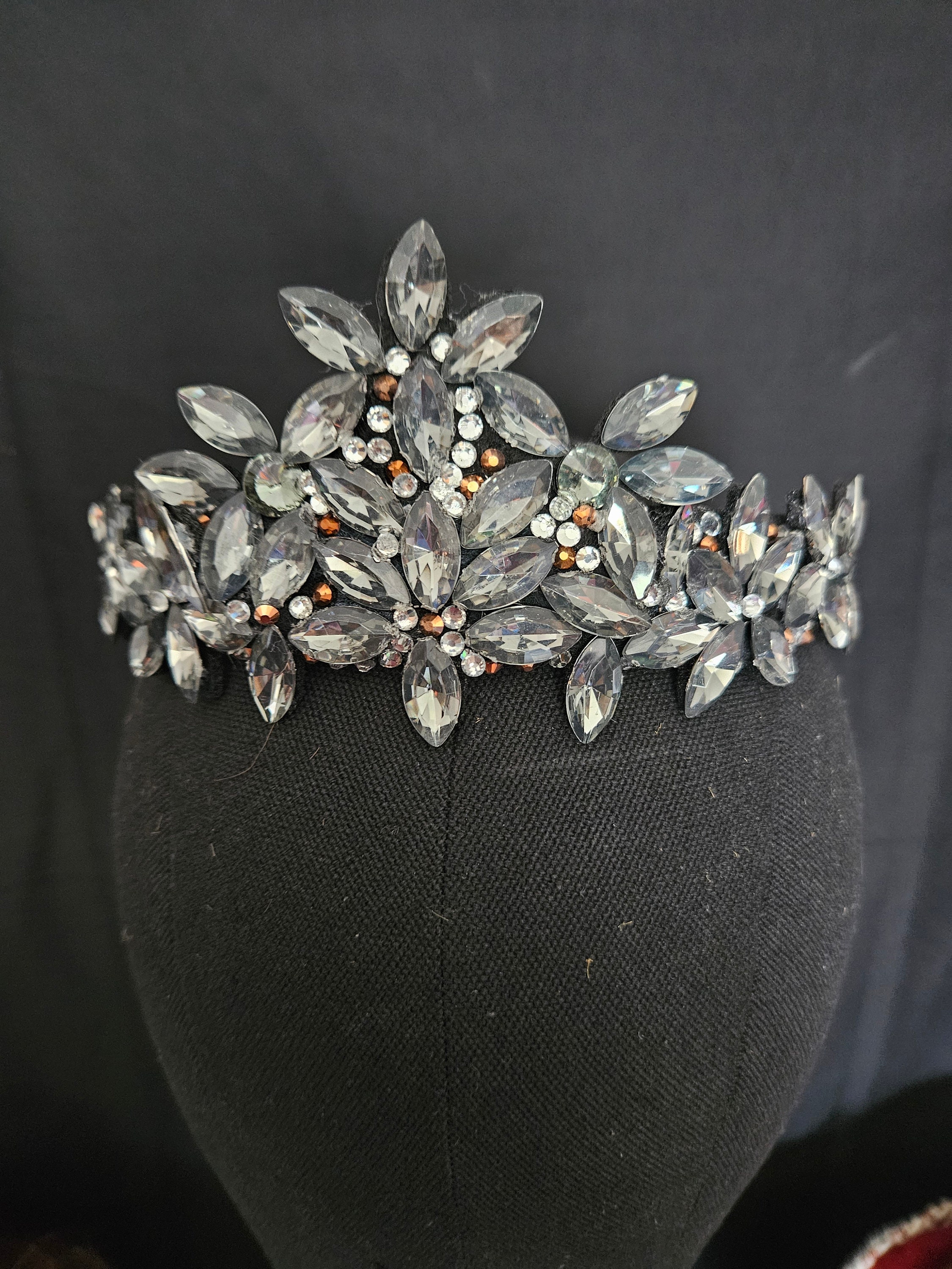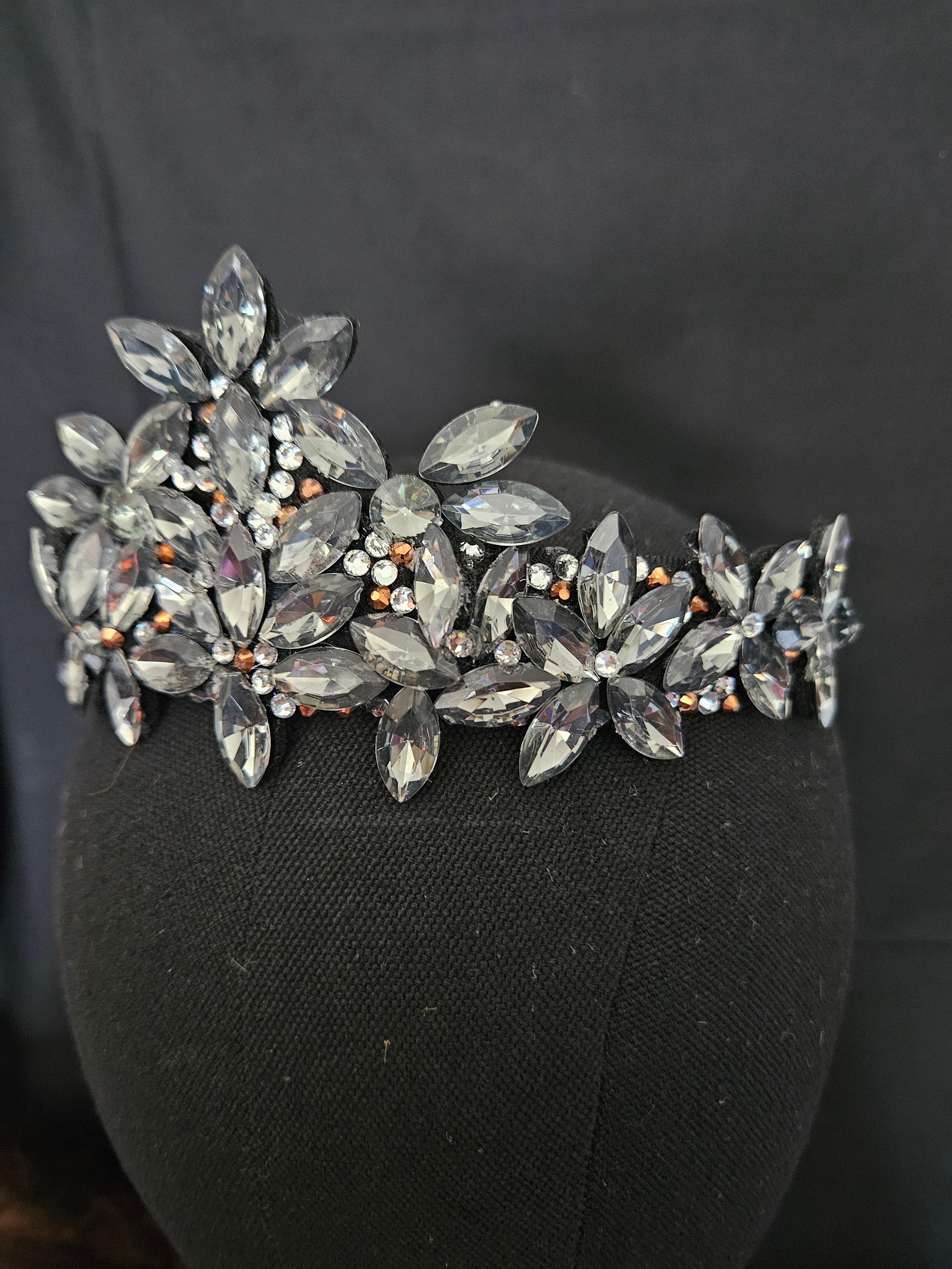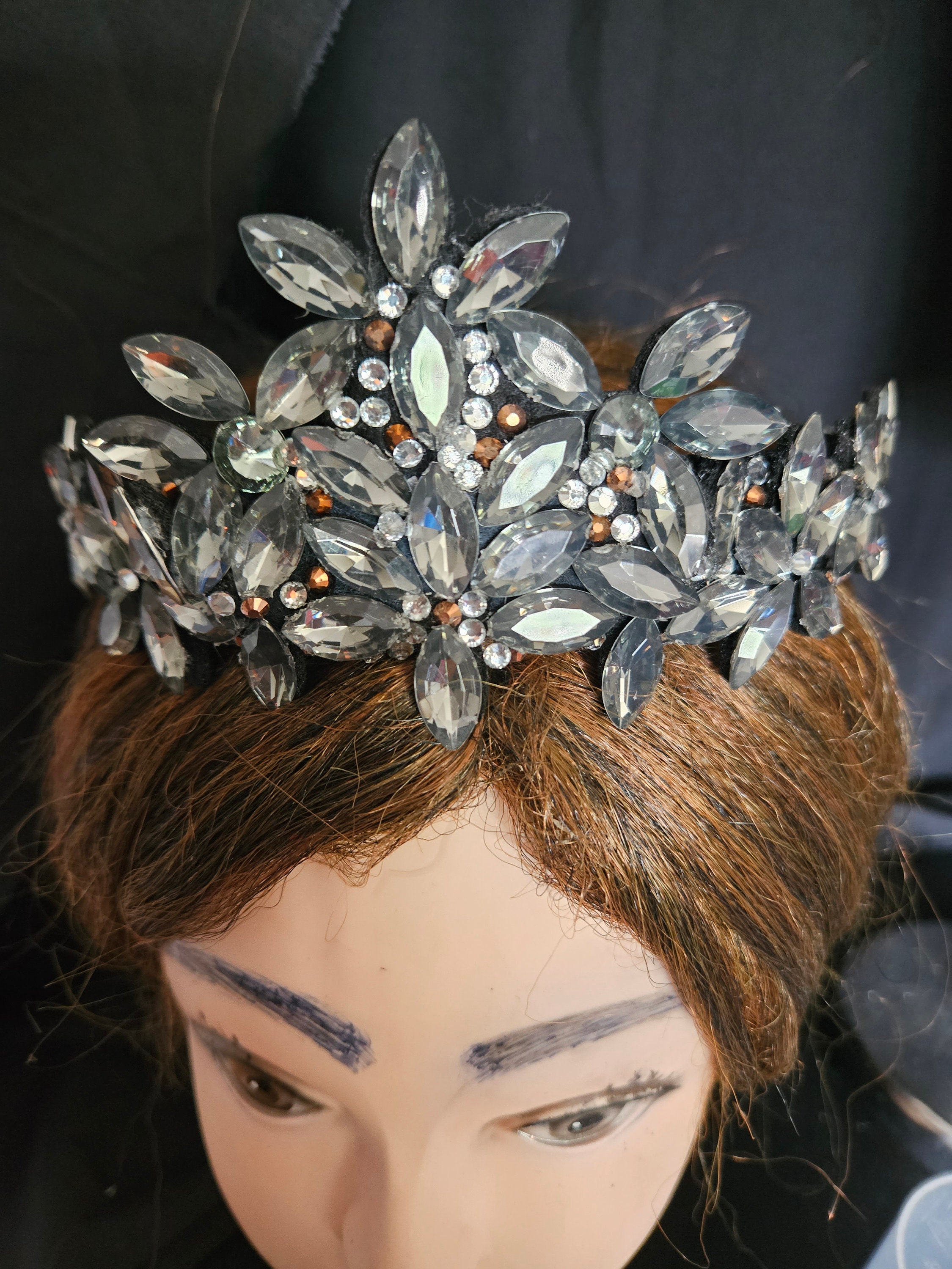 The black tiara, crown, head piece is made of a black satin head band, liquorice black crystals and diamond like rinestones. Very light and comfortable to wear. For adults.