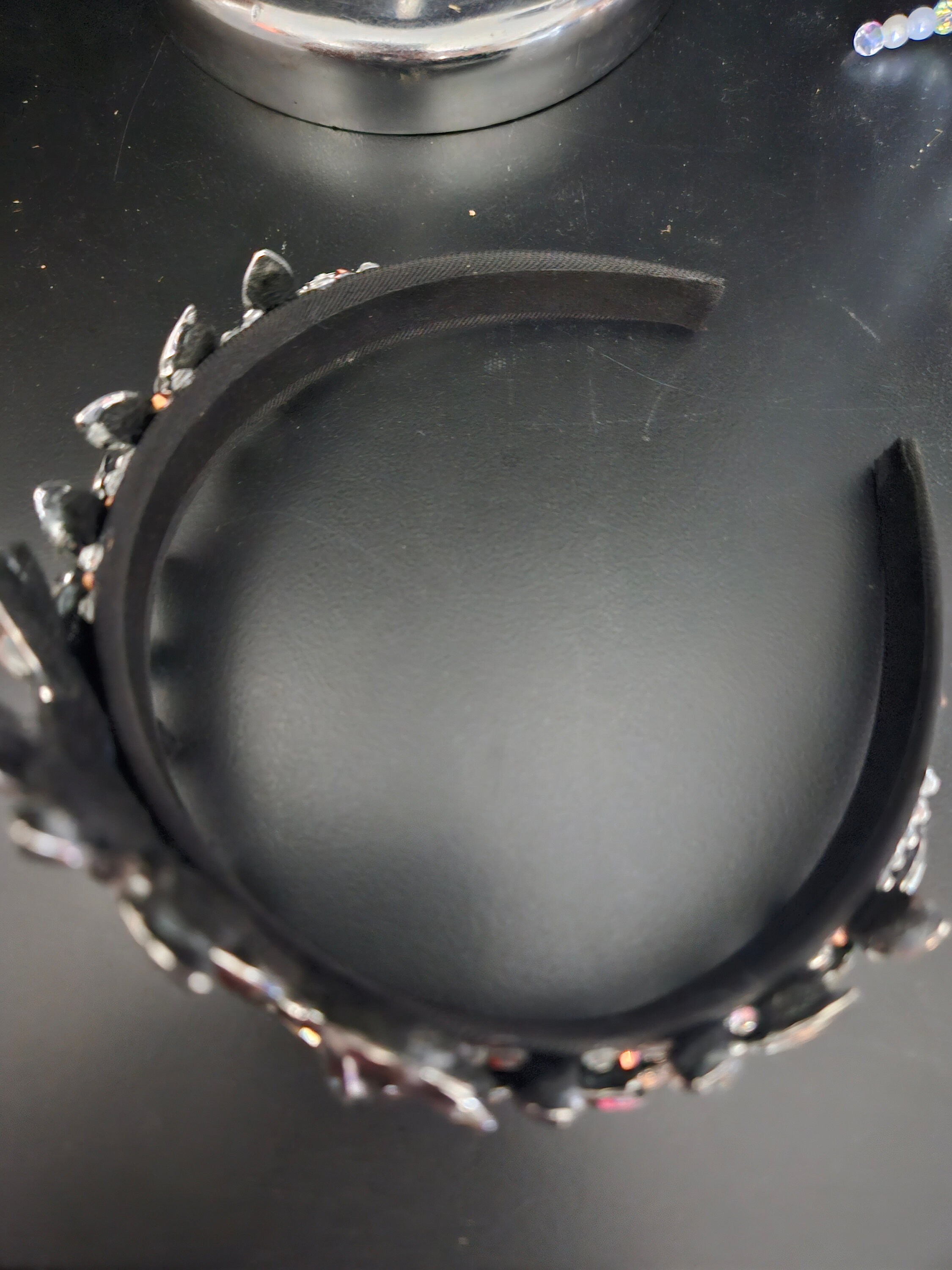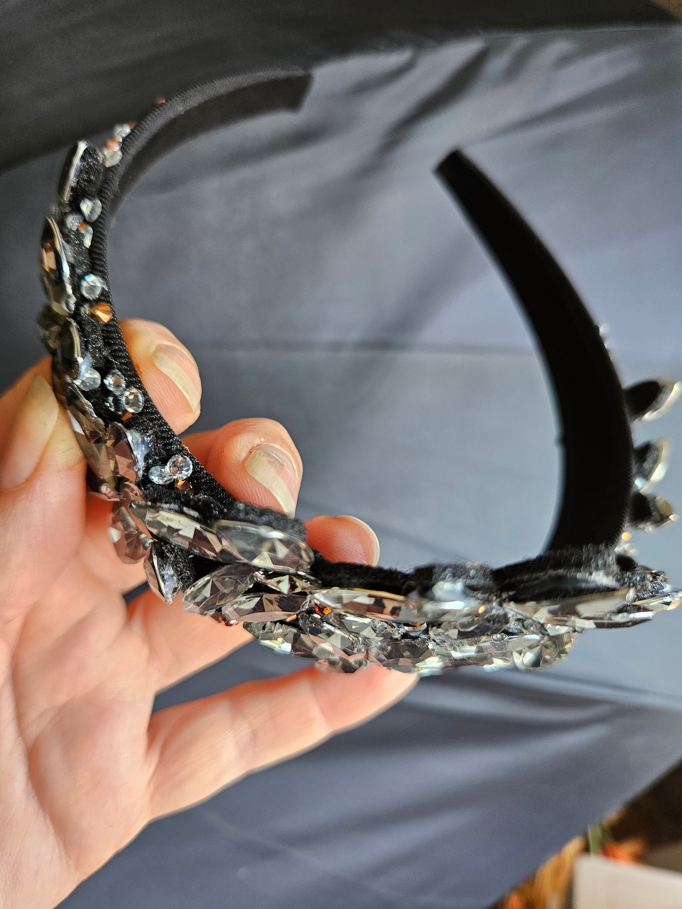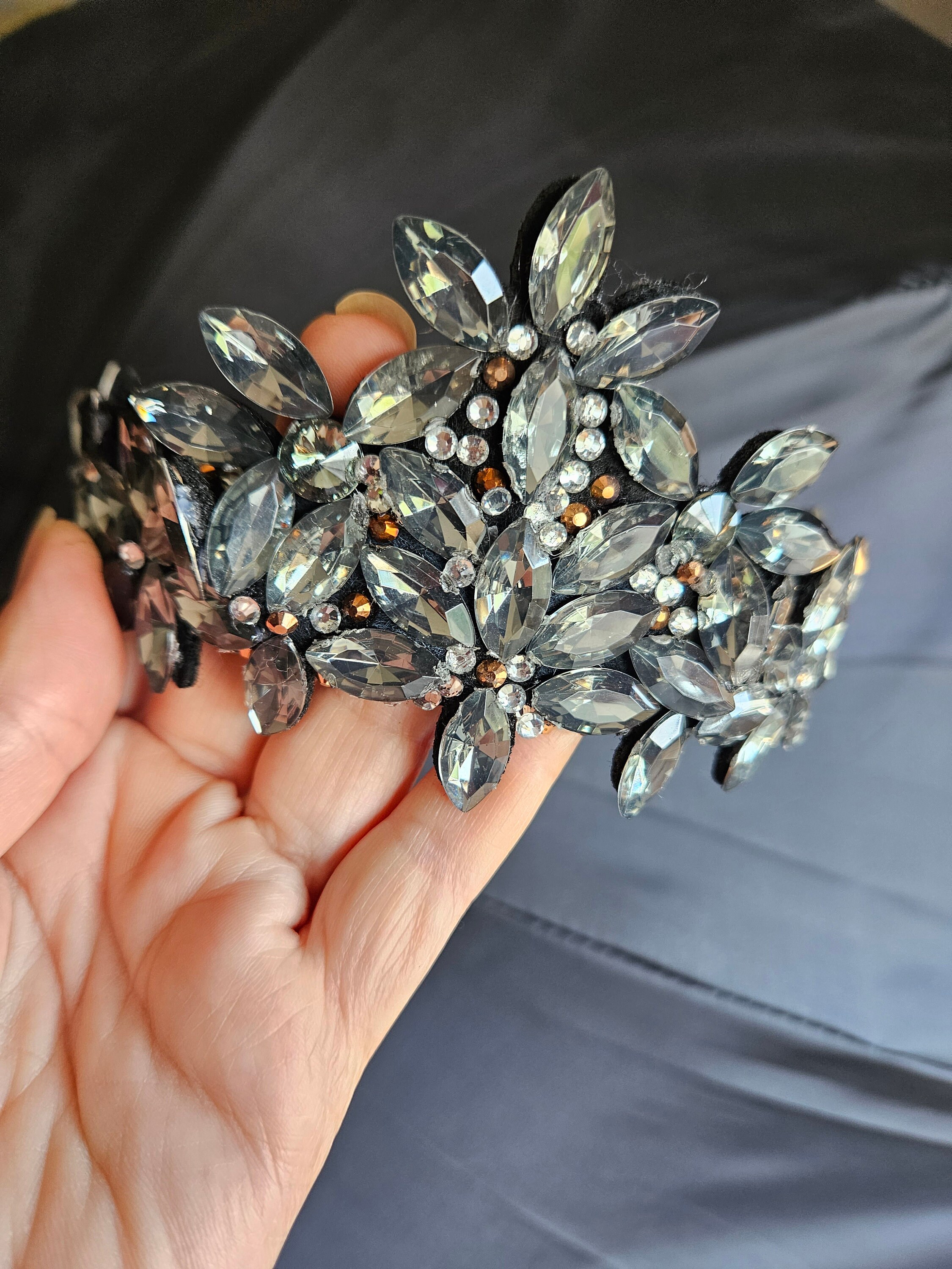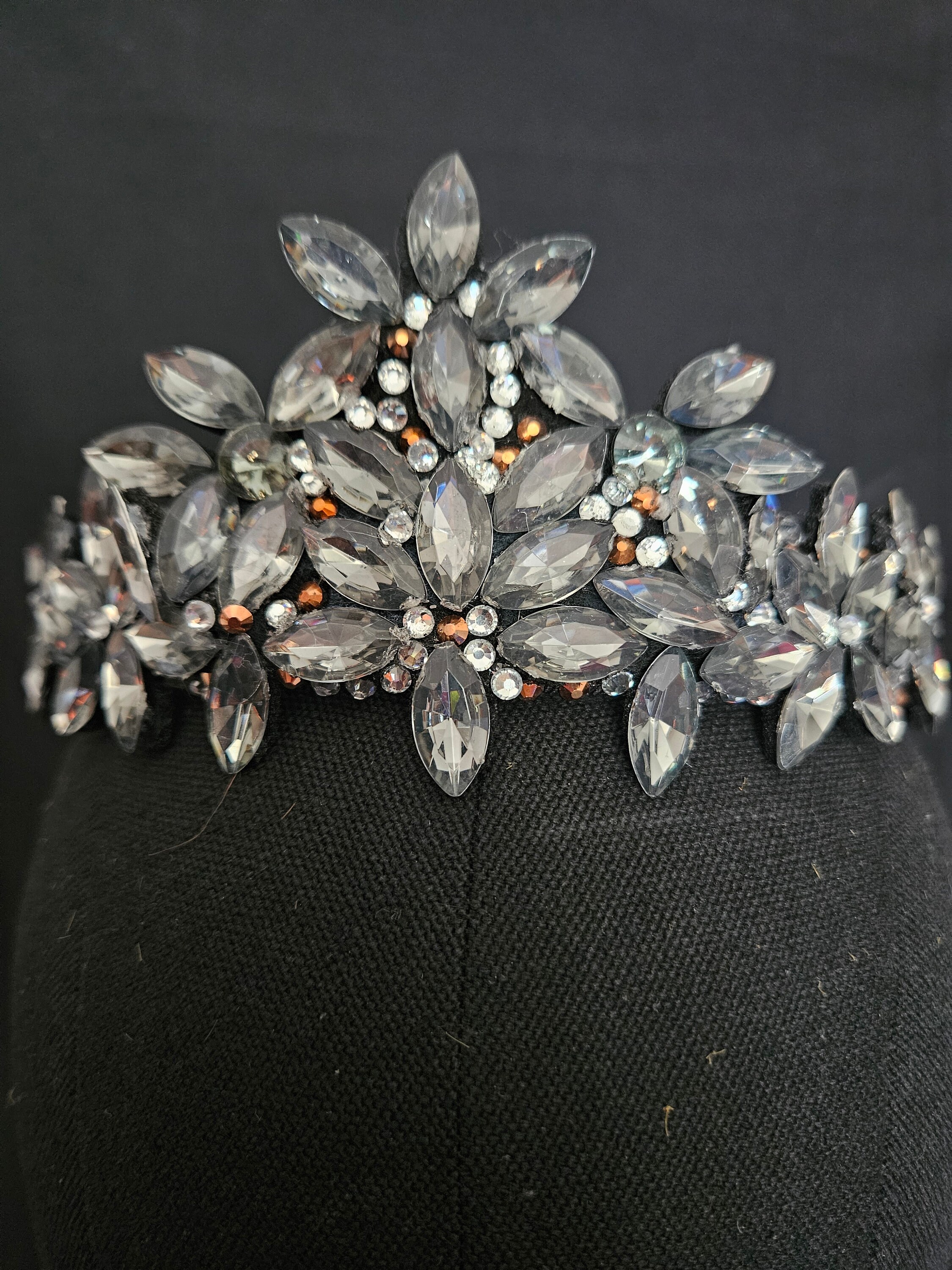 The black tiara, crown, head piece is made of a black satin head band, liquorice black crystals and diamond like rinestones. Very light and comfortable to wear. For adults.