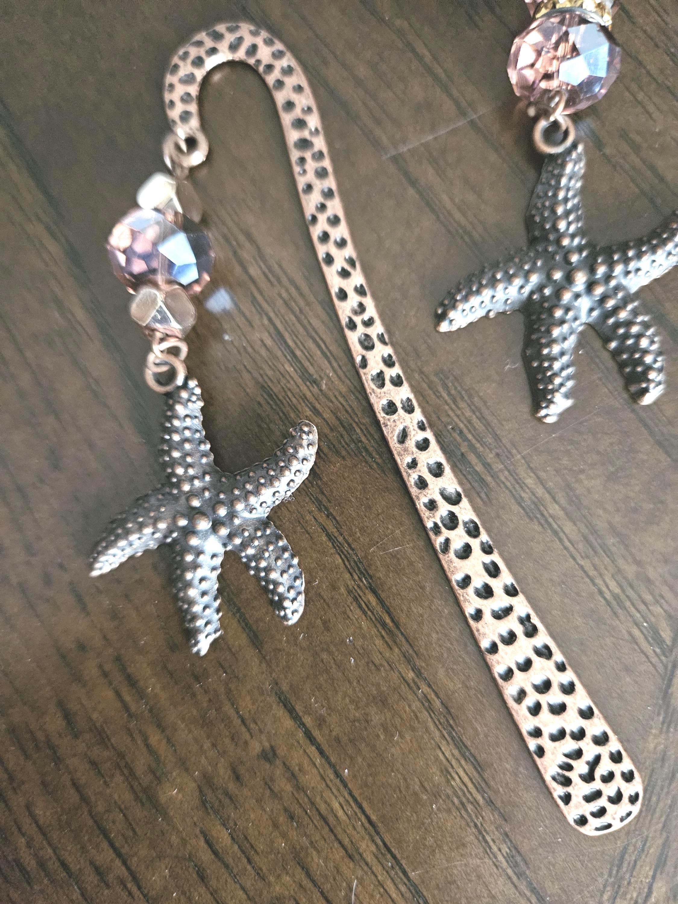 These are coppery dark rose gold color 5 inch long metal bookmarks, decorated with 1 or 2 crystals, rose gold beads and a copper color metal star fish. Option to buy individually or save up by buying the set of 2. They ship in individual velvet pouches for gifts. Fast shipping from Canada