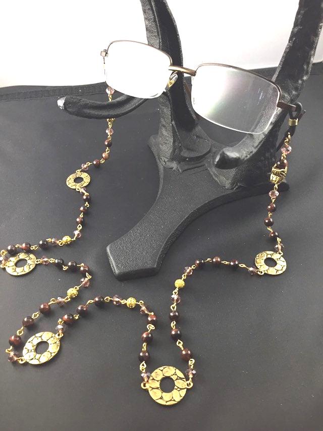 This elegant glass holder is made of 6 mm polished Red Tiger eye gem beads, 6 mm sparkly crystals and gold color round metal pendants for kisses. It has two metal hugs pendants at the top, close to the edge of the chain, and finished with a pair of soft rubber loops to hold the glasses. The length is 34 inches from one edge to the other. Comfortable to wear behind the neck or hanging in the front as a piece of jewelry.