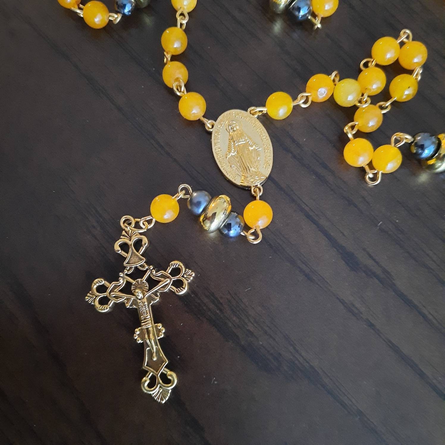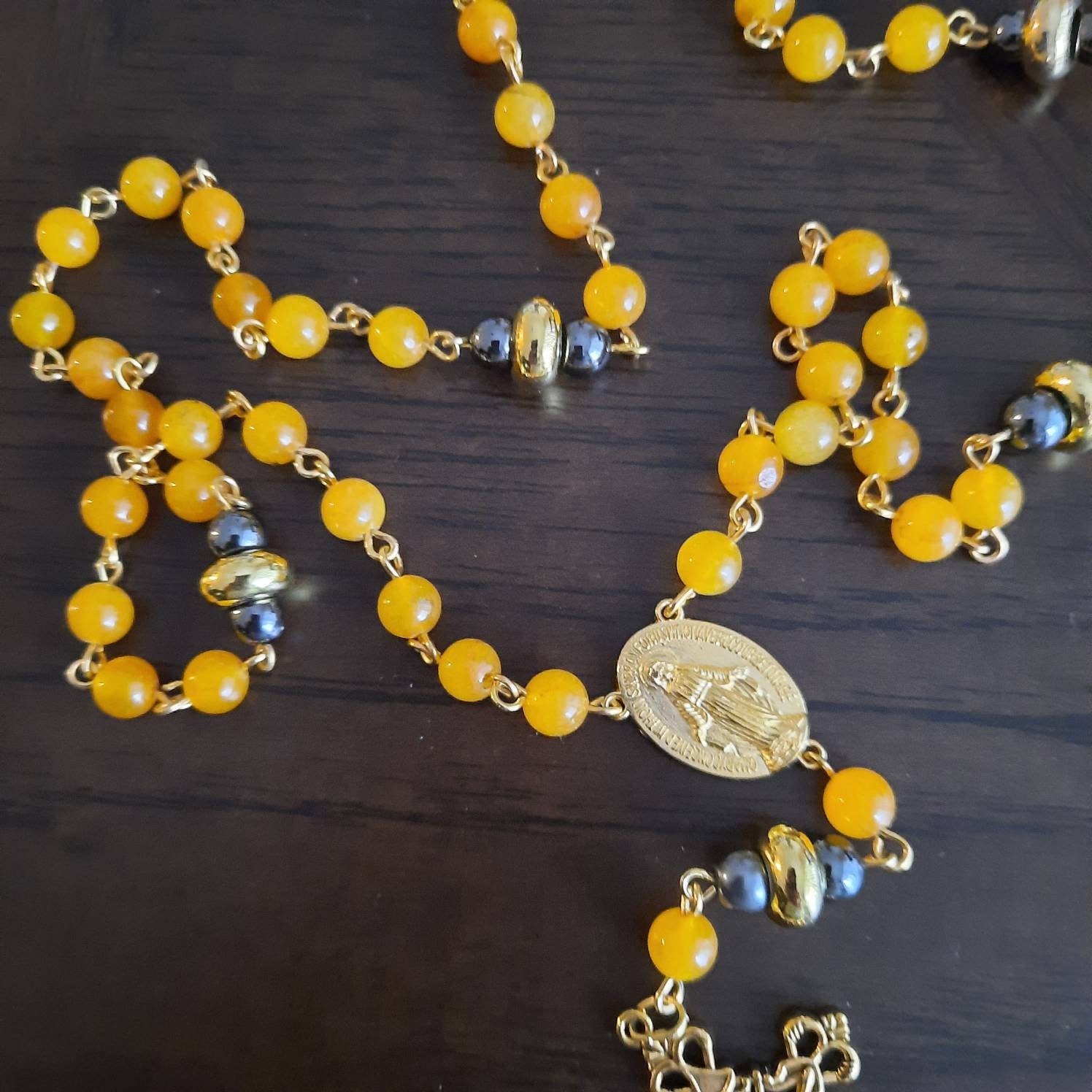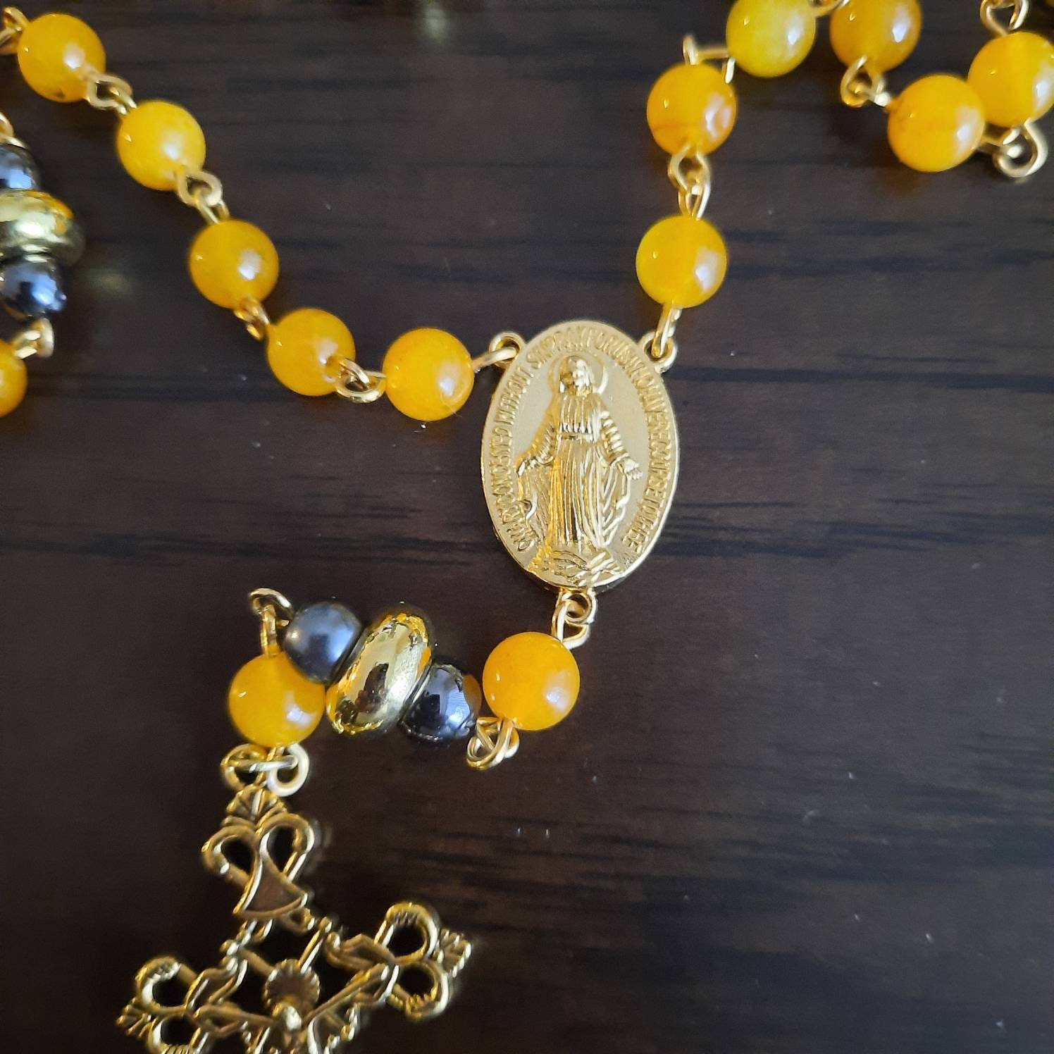 This lovely Jade rosary is made with 50 pcs of delicate 6mm yellow Jade gem beads, black Hematite beads, metal divider rings, spiritual gold color pendant of Mother Mary and a 1 1/2 inch long metal cross.