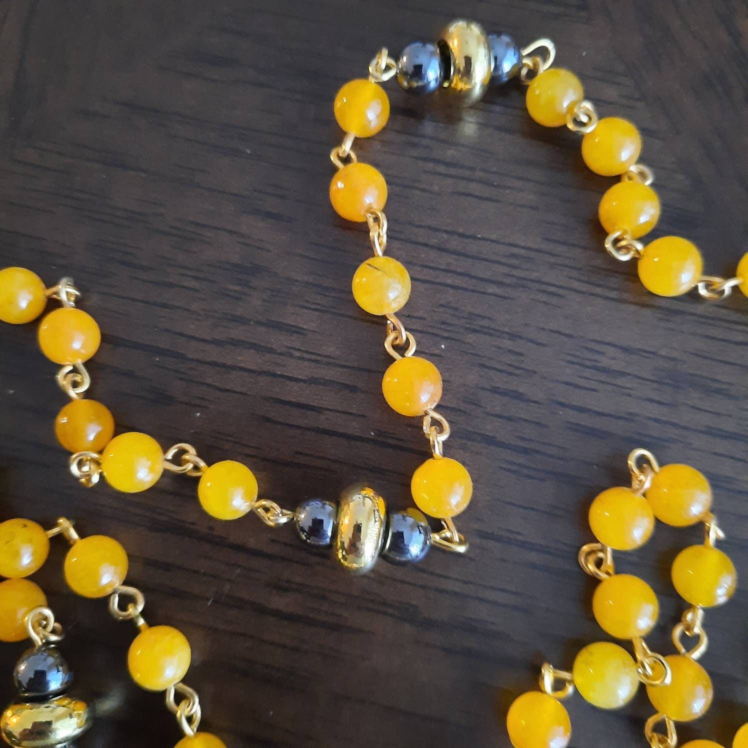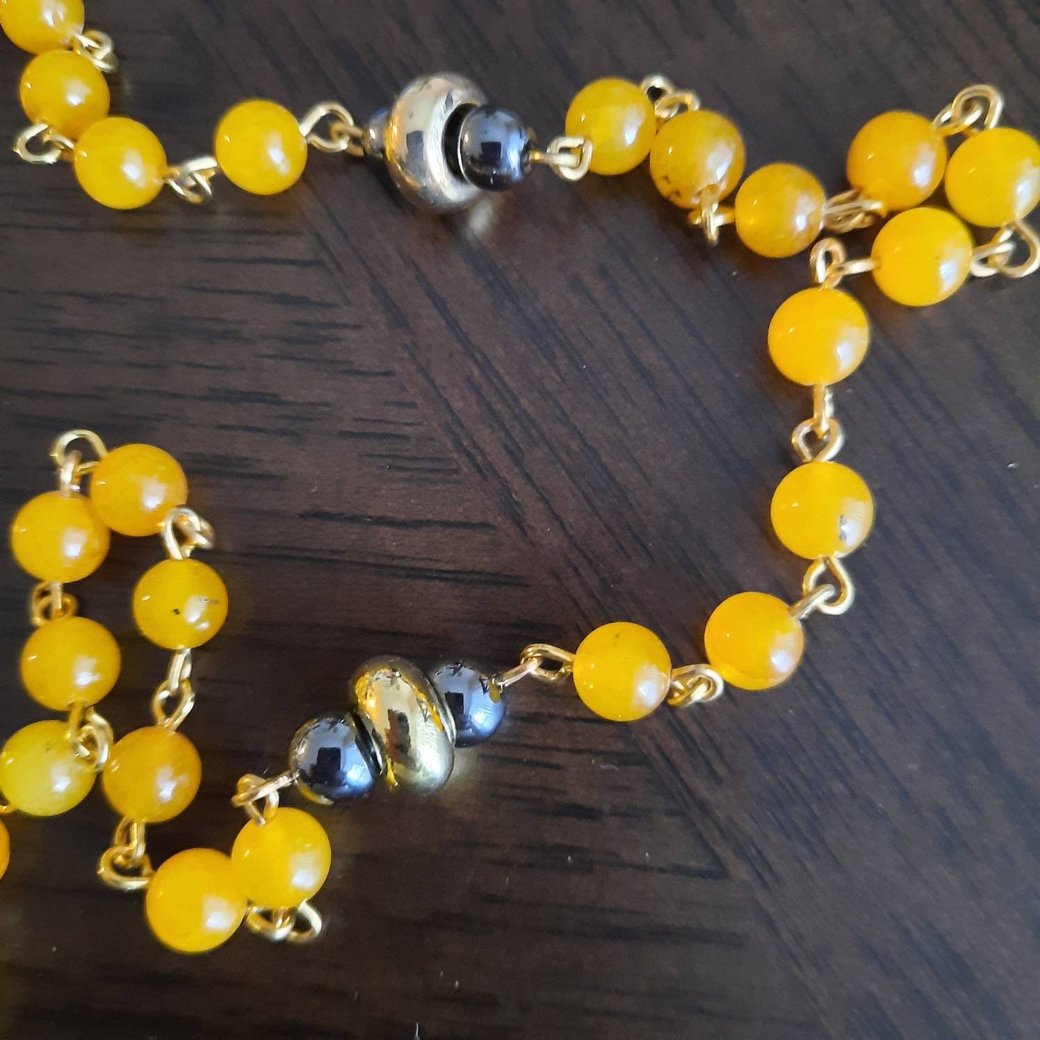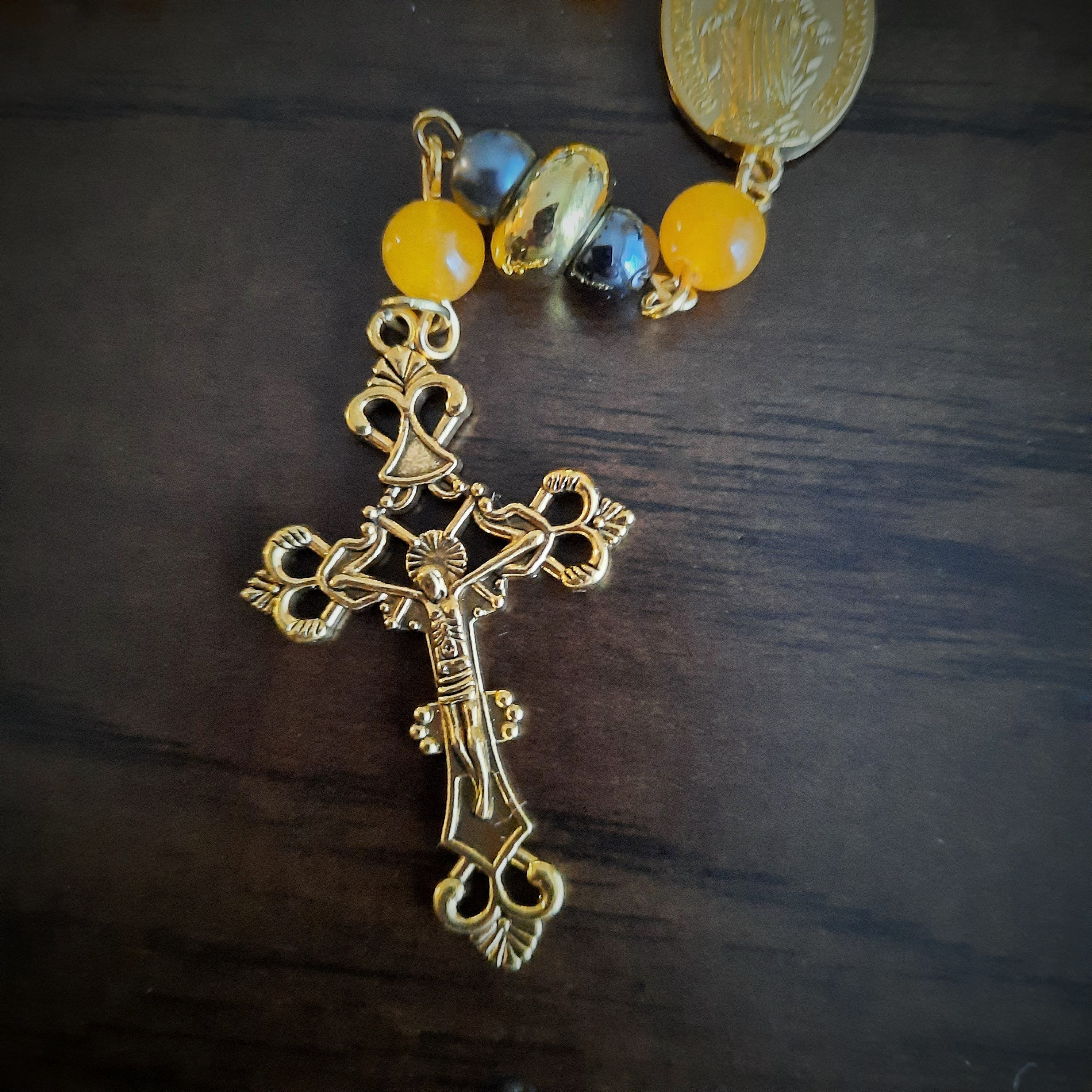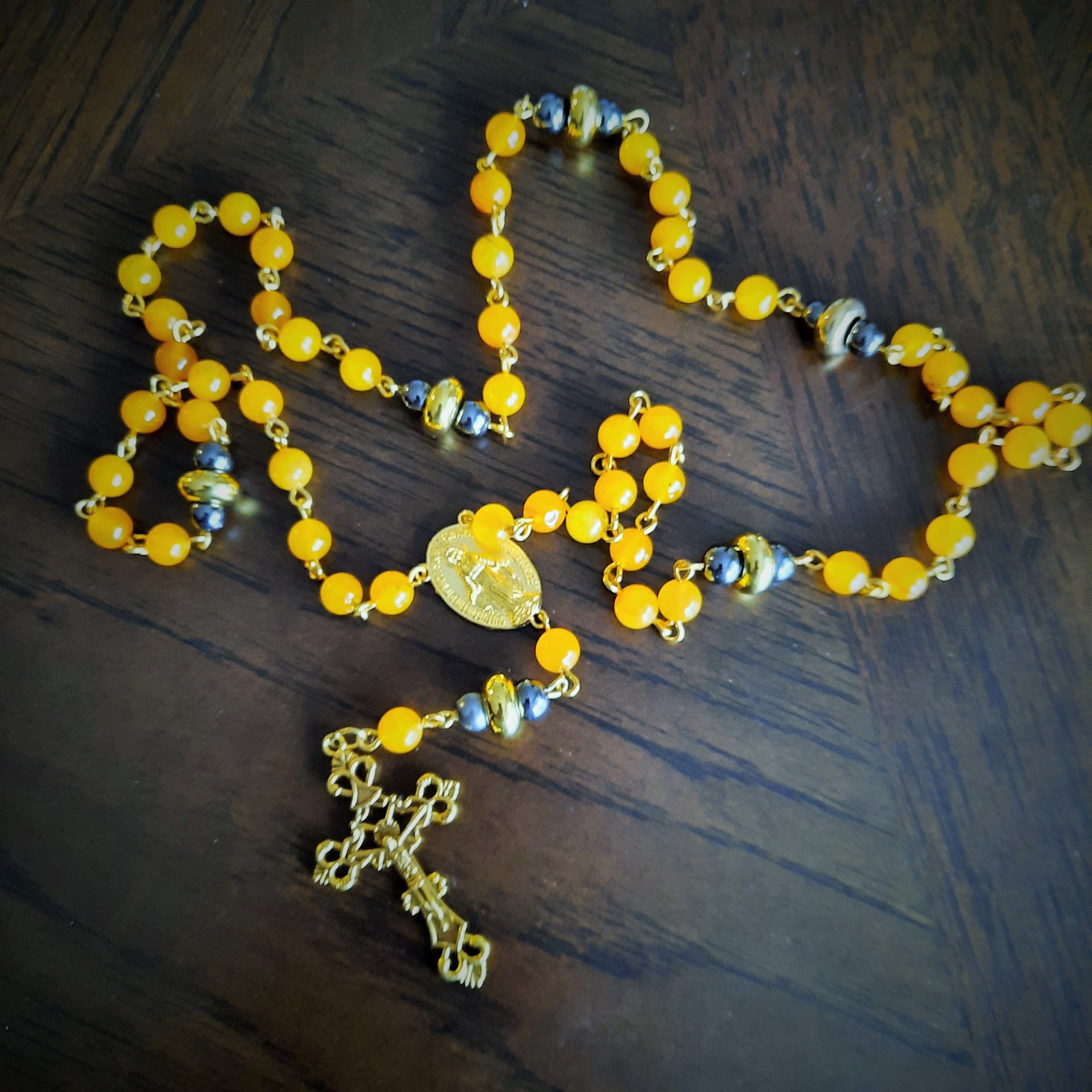 This lovely Jade rosary is made with 50 pcs of delicate 6mm yellow Jade gem beads, black Hematite beads, metal divider rings, spiritual gold color pendant of Mother Mary and a 1 1/2 inch long metal cross.